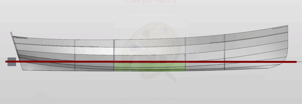 Emmanuel indique : « Ce profil montre la position du ballast, en vert, sur les cotés du puits de dérive. Le dessus des réservoirs est au niveau de la flottaison, comme sur Gandalf.«